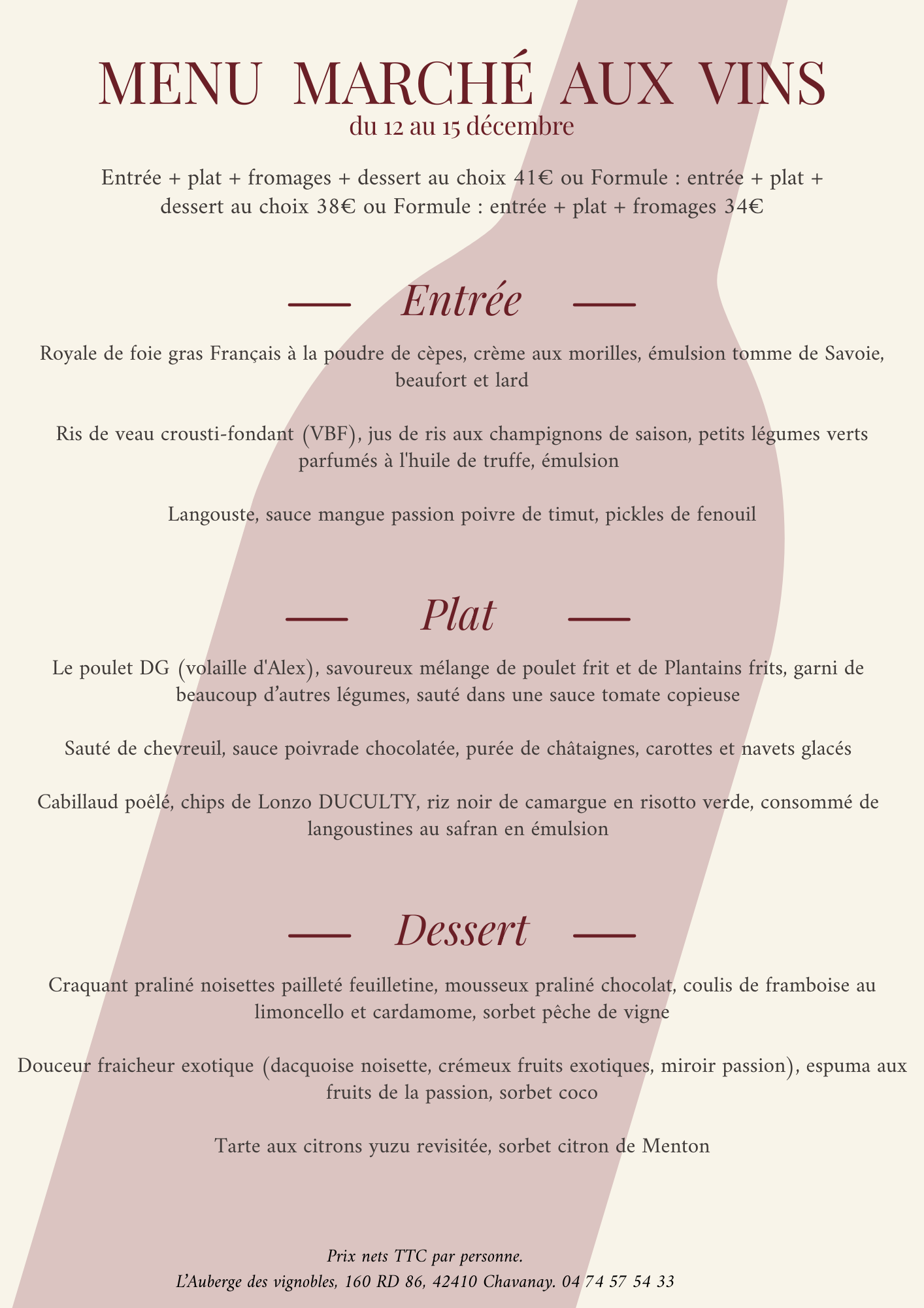 Formule : entrée + plat + dessert au choix 38€ / Formule : entrée + plat + fromages 34€ / Service uniquement les soirs et weekends, possibilité de commander en semaine 24h à l’avance